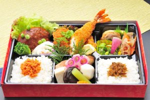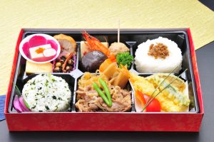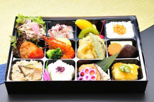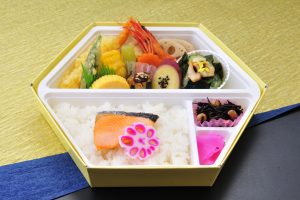 12枡の箱に和のテイスト中心に盛り込んだお弁当です。彩りよく詰め合わせました。