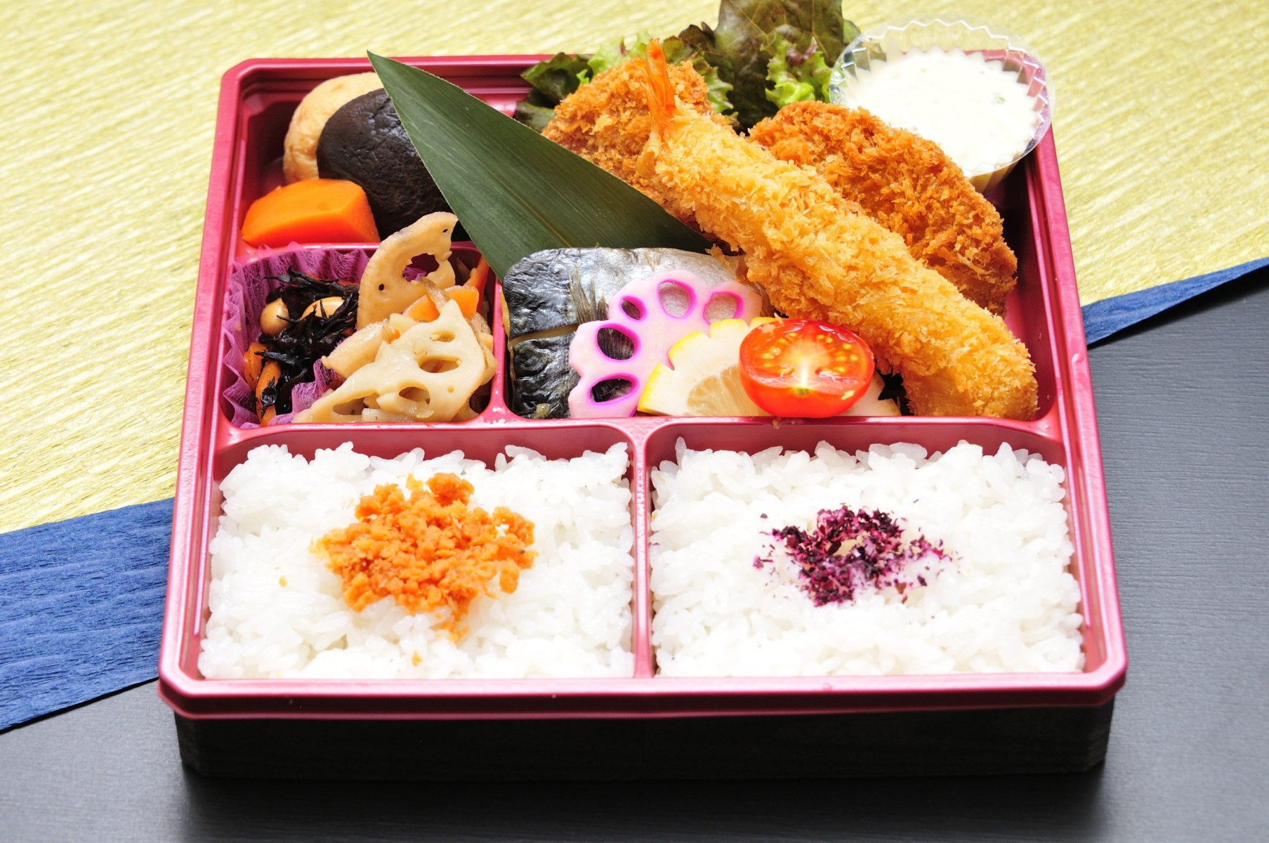 太いエビフライやヒレカツ・焼魚も盛り込んだ、和洋折衷のお弁当です。何からお召し上がりになるか迷って下さい!! (写真にはありませんが自家製タルタルソース付き)