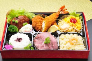 自家製デミグラスハンバーグ・太いエビフライとヒレカツ・ローストビーフなどソース類まで手作りにこだわった、洋食よくばり弁当です。ぜひご賞味下さい。